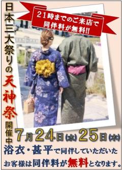 響乃ではこの天神祭り期間中に21時迄に浴衣・甚平を